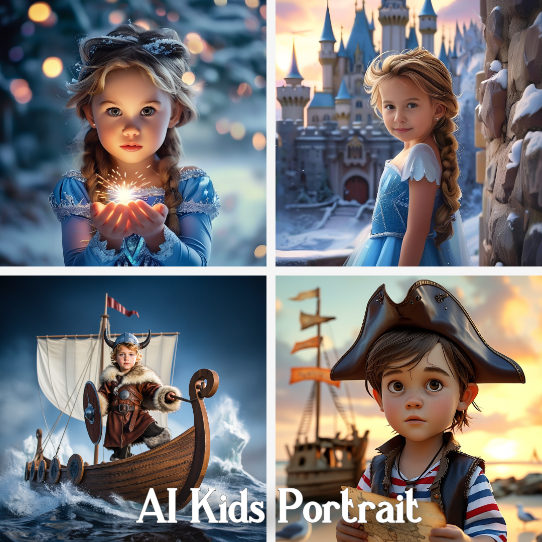The portrait created with AI is not an exact copy of the original photograph but a carefully adapted artistic interpretation that matches the chosen theme while preserving your child’s unique features.